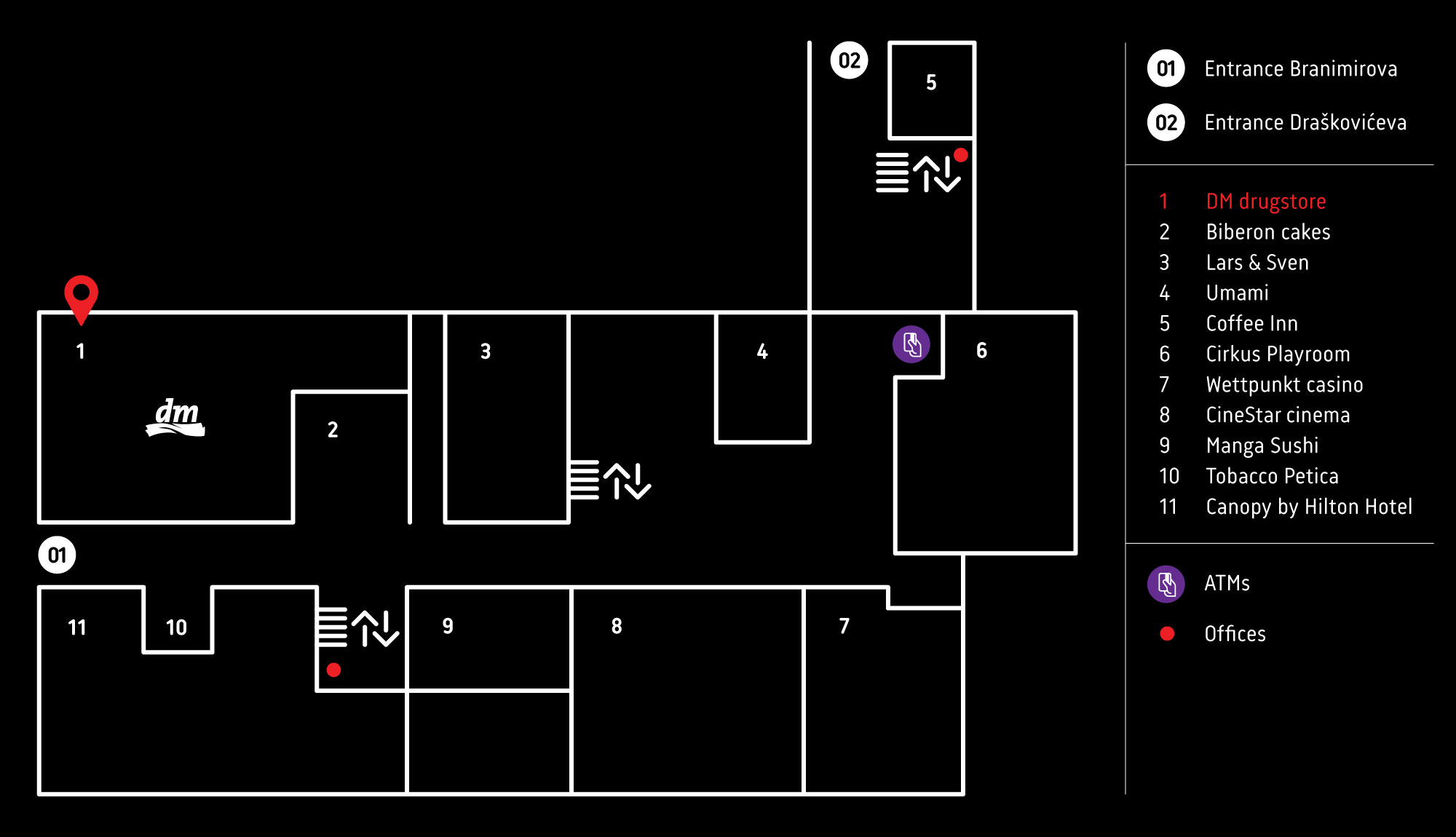 Also, there is an offer of natural cosmetics and quality products of dm brands, which is why you will have a more favourable shopping, and after that, feel free to stop by at one of the restaurants in Branimir mingle mall.